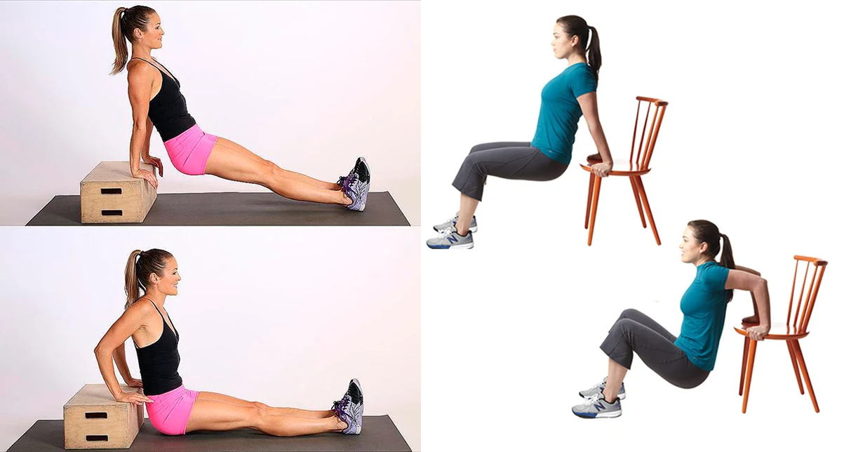 Position your hands shoulder-width apart on a secured bench or stable chair. Slide your butt off the front of the bench with your legs extended out in front of you. Straighten your arms, keeping a little bend in your elbows to keep tension on your triceps and off your elbow joints.