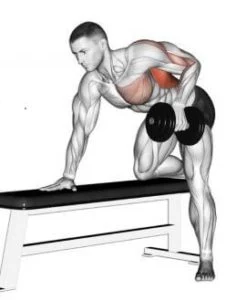 Choose a flat bench and place a dumbbell on each side. Hold a dumbbell in one hand and step forward with the opposite leg. Bend your torso forward from the waist until it’s approximately parallel to the floor and place your hand on the end of the bench for support. Row the weight to your side until your upper arm is just beyond horizontal. Do not rotate your torso in an effort to throw the weight up. Lower the weight down until your arm is fully extended and repeat.